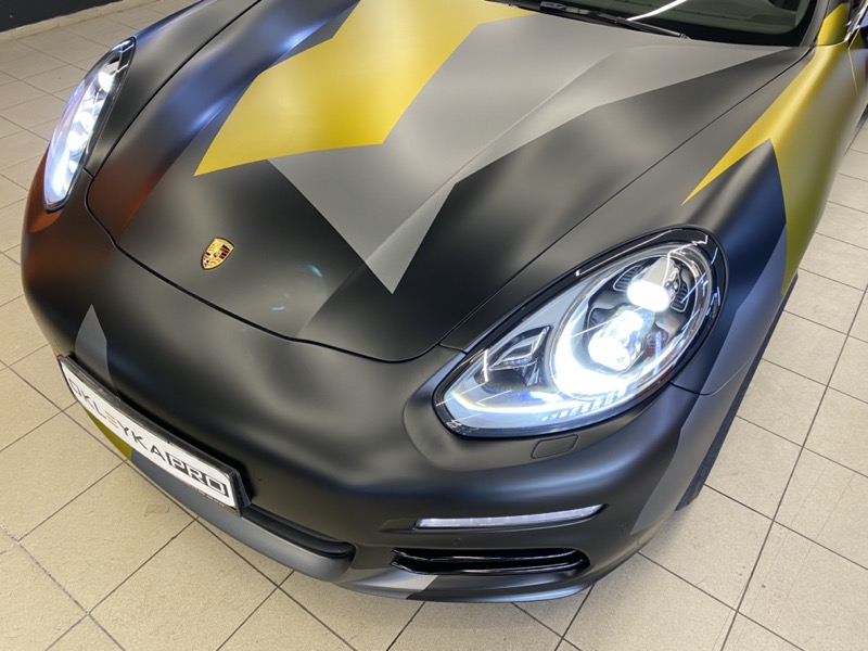 Полная оклейка автомобиля в черный матовый сатин и нанесение на него дизайнерского камуфляжа: цвет золотистый матовый хром, серебристый матовый хром.